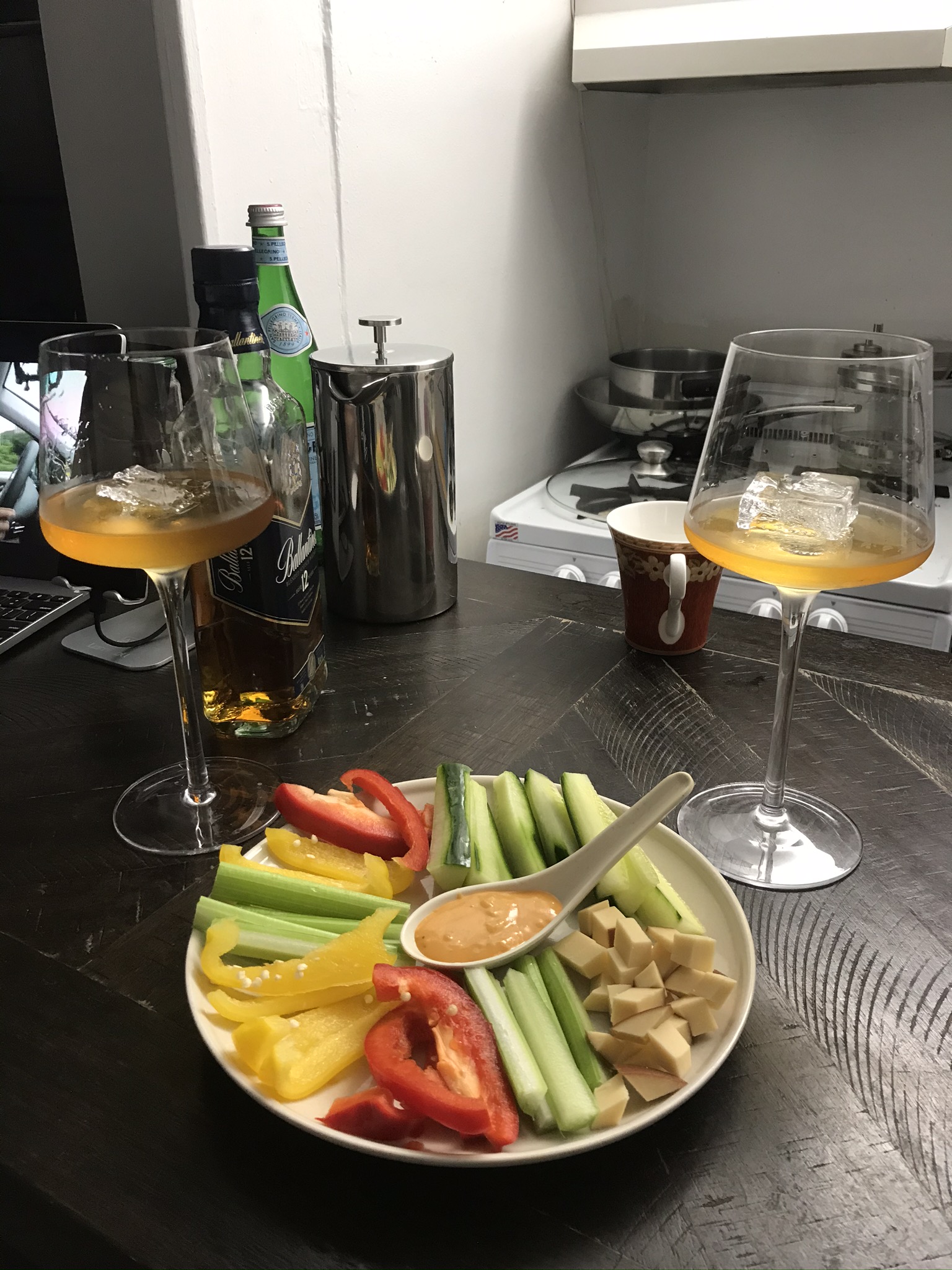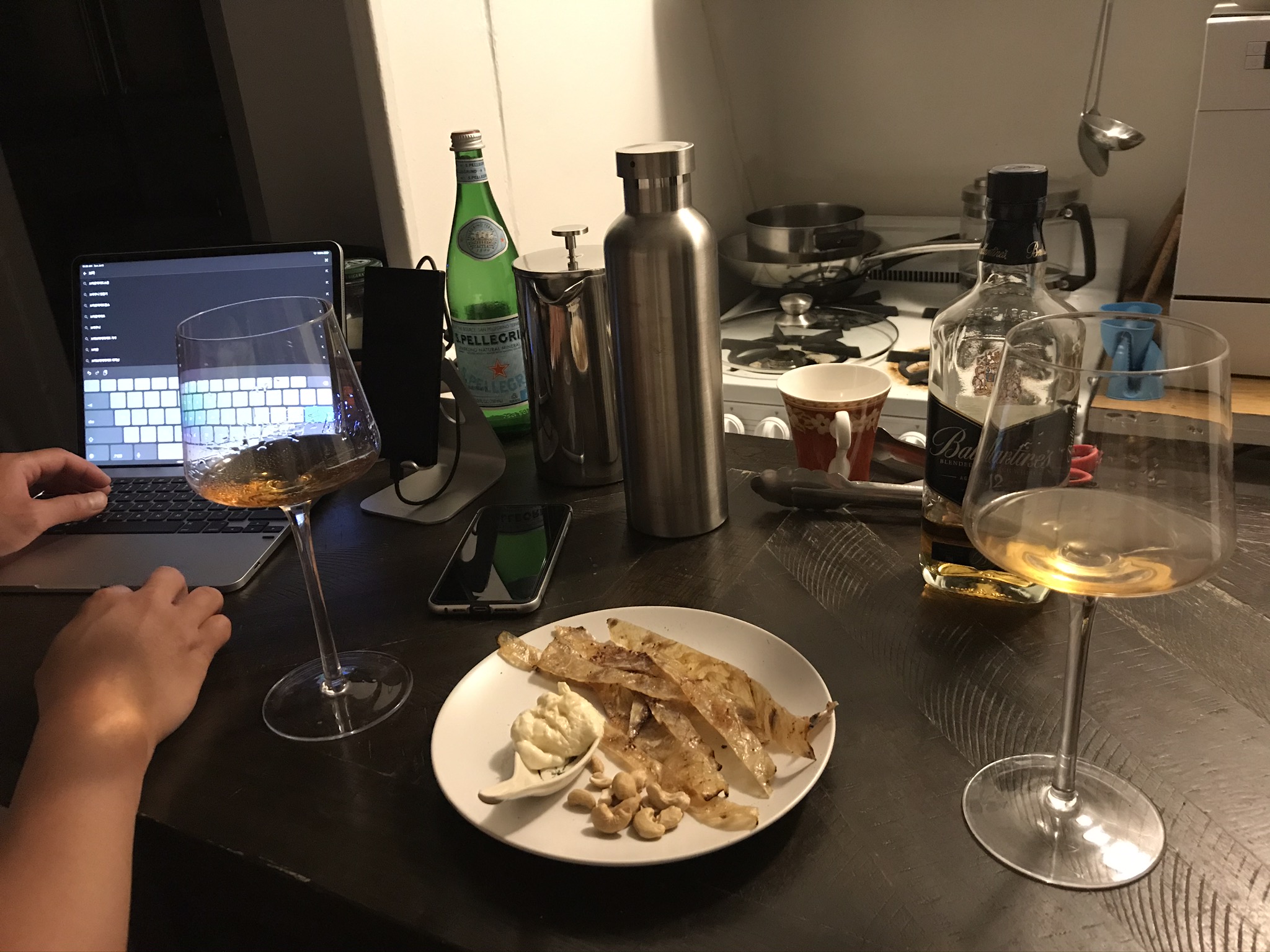열심히 놀았으니 또 한잔 .. ㅋㅋ 위스키잔이 없어서 와인잔에 따랐음. 안주는 뭔가 한국바의 모듬야채