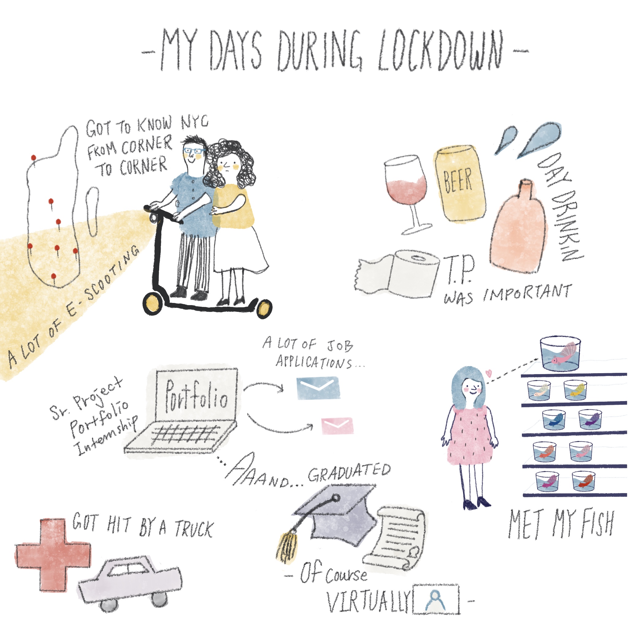 코로나 일지 1편과 2편을 통틀어 요약하자면 위 그림과 같다. 스쿠터 타고 돌아다니고, 낮술하고 화장지 사러 다니고, 학교 과제하고 졸업하고 취업하고, 교통사고가 났었고, 물고기 키운 사진은 귀찮아 올리지 않았지만 그또한 나의 큰 일상이었다 ㅎㅎ