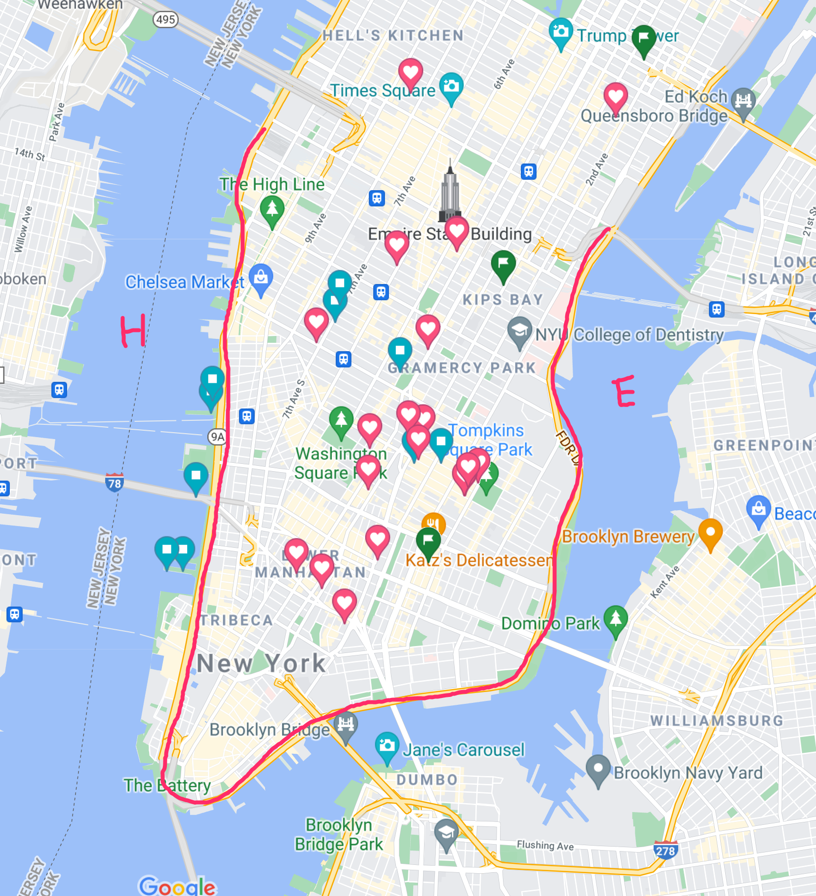 물론 상대적으로 최근에 개발된 허드슨리버 쪽 파크가 정말 이쁘고(H라고 표시한 왼쪽 강ㅋㅋ) 풍경도 뉴저지를 바라보기 때문에 아름답다.